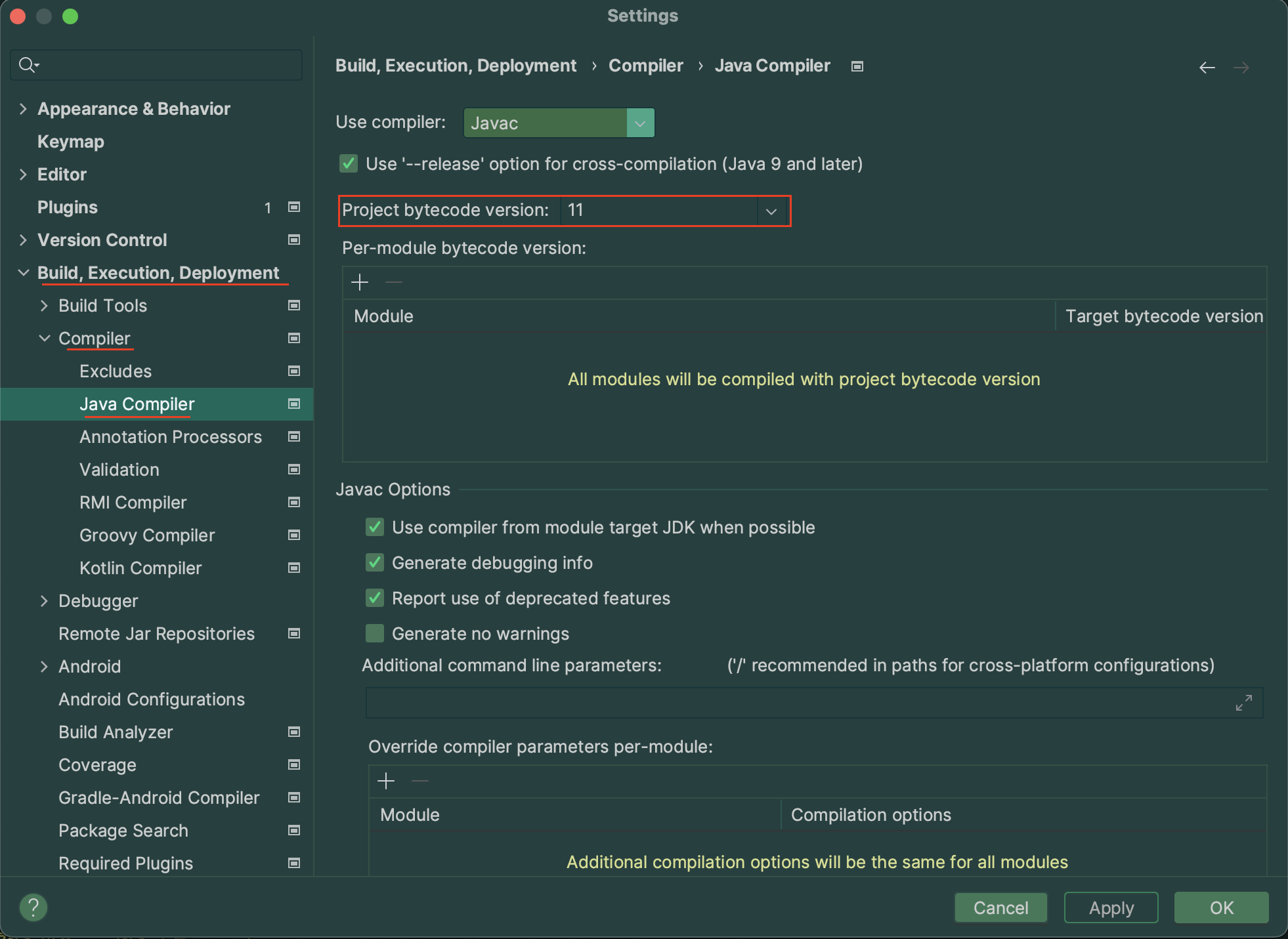 에 들어가서 project bytecode version 을 낮추면 된다.