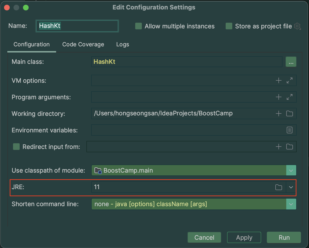 IDE 상단 run 버튼 옆에 edit configuration 에 들어가서
