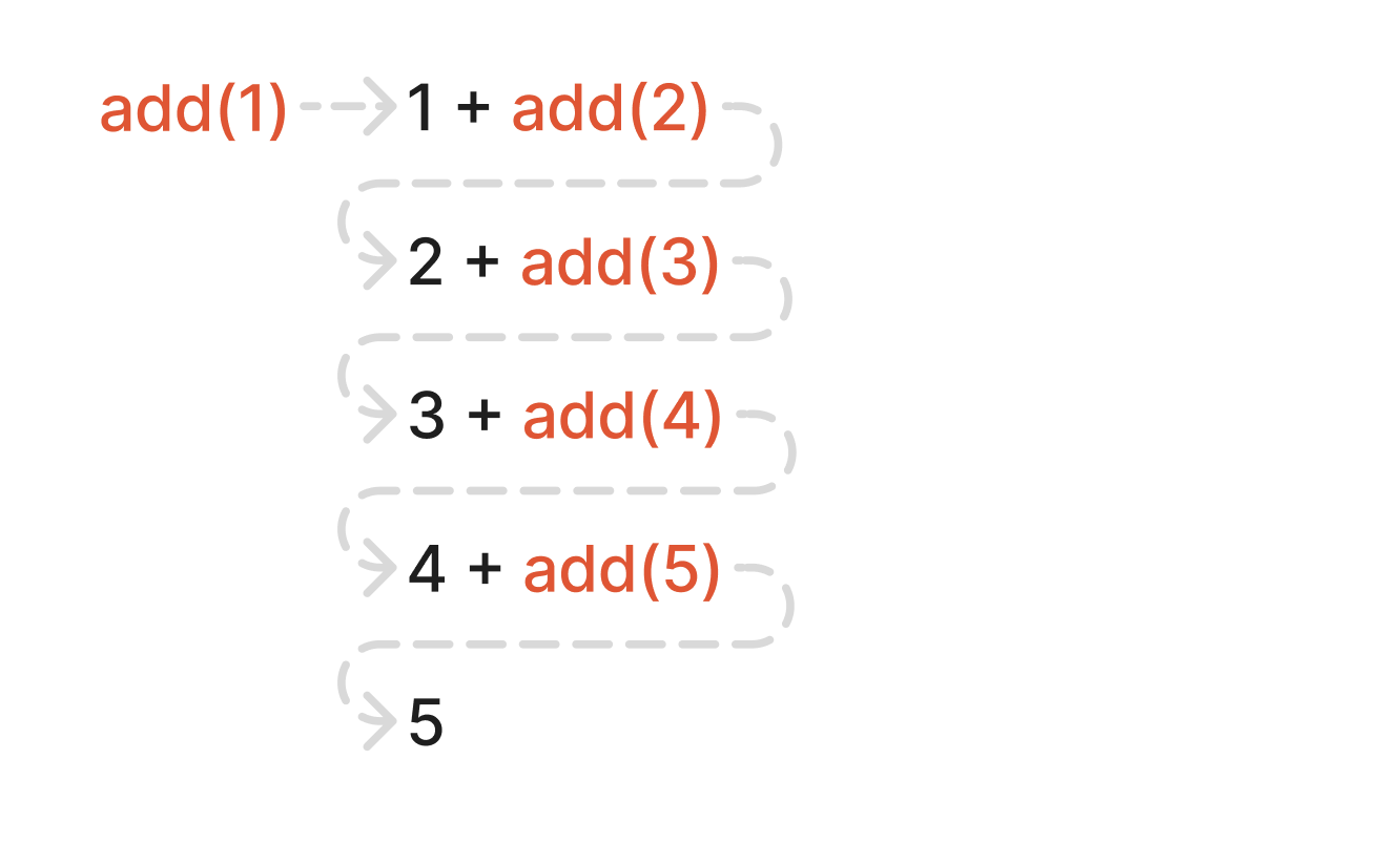 1 부터 5 까지 더하는 작업을 재귀 함수 를 이용하면 다음과 같이 작성할 수 있다.